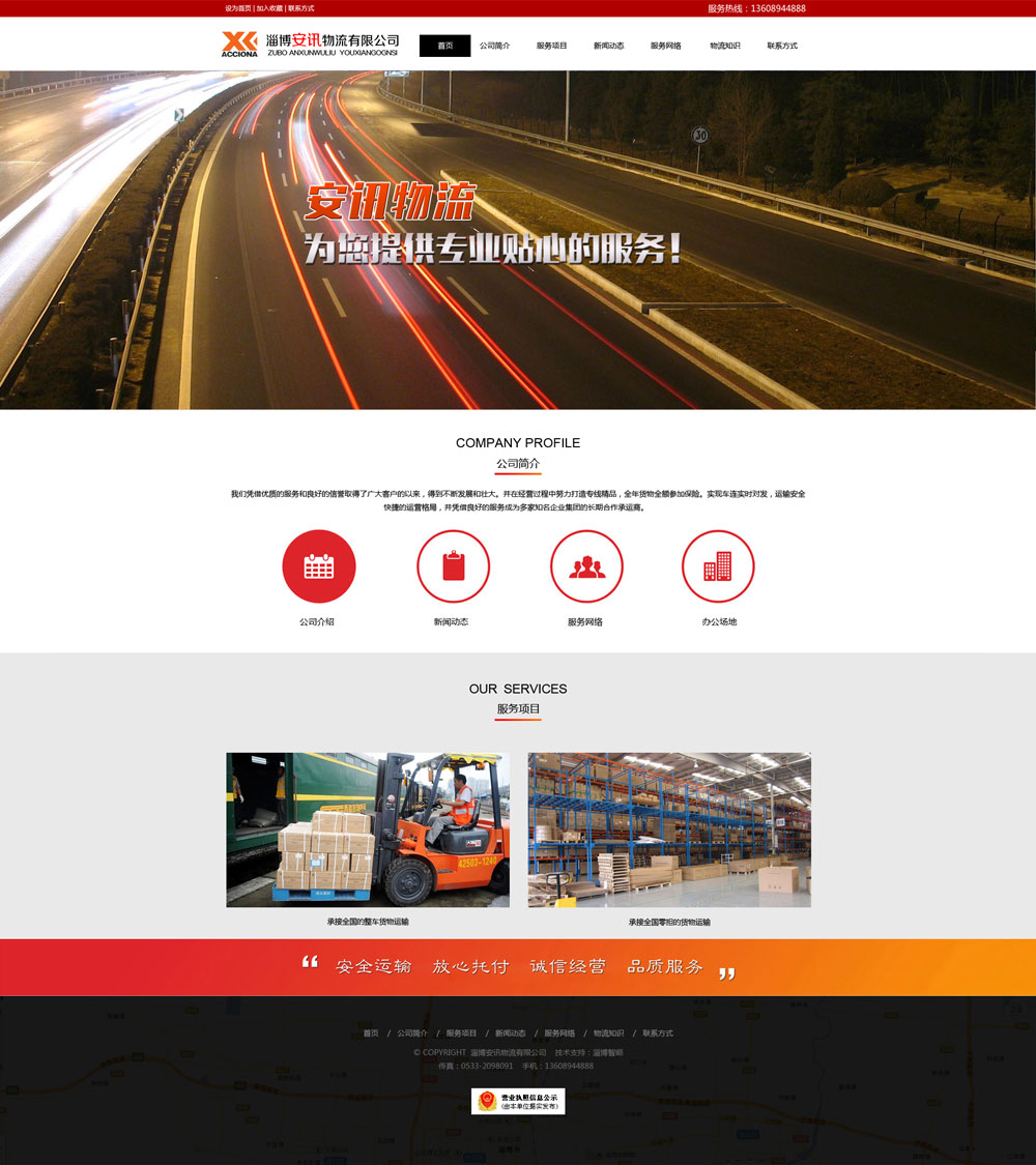 淄博安訊物流有限公司憑借優(yōu)質的服務和良好的信譽取得了廣大客戶的信賴,公司的發(fā)展和壯大離不開客戶的信賴與支持。并在經營過程中努力打造物流行業(yè)的精品,全年貨物全額參加保險,運輸安全,公司承諾貨物的丟失與損壞公司全額承擔,交貨時間按客戶要求交付貨物。